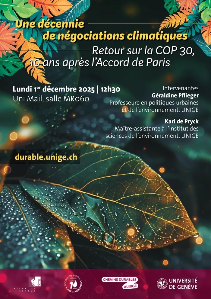 Géraldine Pflieger and Kari De Pryck will provide an in-depth analysis of the challenges, limitations, and future directions of international climate negotiations, a decade after the Paris Agreement. The talk will delve into the operation, role, and hurdles faced by the COP conferences in combating climate change, highlighting the diverse influences and vested interests involved, as well as addressing accusations of manipulation by oil industry lobbies. Géraldine Pflieger is a professor of urban and environmental policy at the University of Geneva, and Kari De Pryck is an assistant lecturer at the Institute for Environmental Sciences.