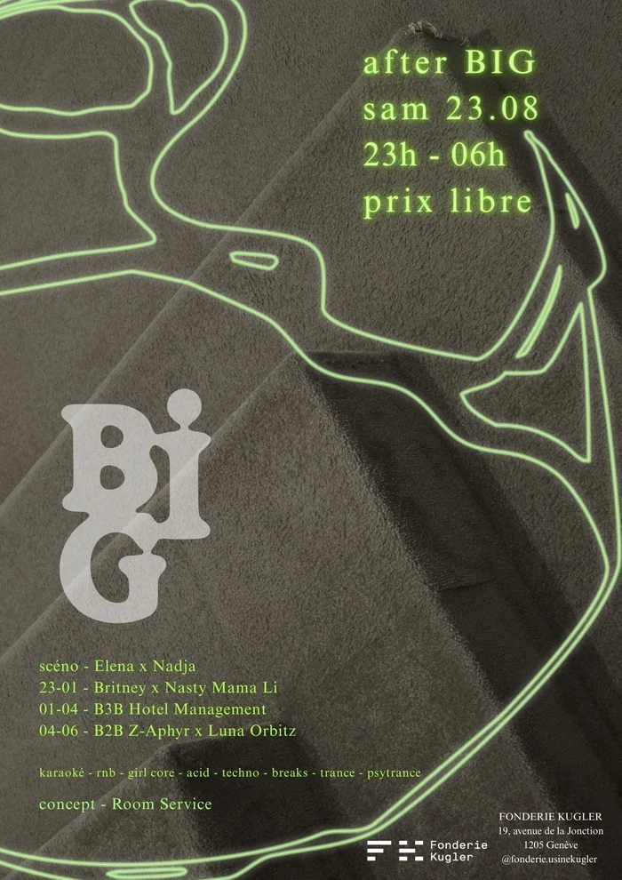 BIG x Room Service x Fonderie Kugler invites you to an eclectic and festive evening, reimagining space and time. With a line-up that spans from funk to acid tech, the event promises a one-of-a-kind atmosphere. Britney and Nasty Mama Li will take you on a journey through 2000s hits, while Hotel Management explores genres from minimal to acid tech. Z-APHYR and Luna Orbitz will blend their psytrance and acid styles in an unforgettable back-to-back performance. Get ready for a celebration marked by musical diversity and joyful reunions!