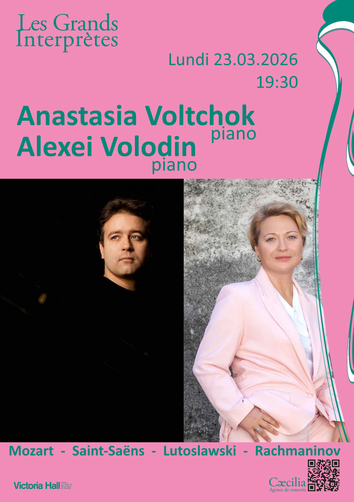 Pianists Anastasia Voltchok and Alexei Volodin will perform works by Mozart, Saint-Saëns, Lutosławski, and Rachmaninov as part of the Les Grands Interprètes series. The program features Mozart’s Sonata for Two Pianos in D major, Saint-Saëns’ Variations on a Theme by Beethoven, Lutosławski’s Paganini Variations, and Rachmaninov’s Suite No. 2.
