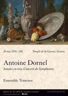 Led by Ensemble Temenos, this programme reunites trio sonatas, suites of symphonies, a flute sonata and organ pieces by Antoine Dornel. The ensemble, with Alice Julien-Laferrière (violin) and Karel Valter (traverso), explores the refined elegance and inventive balance of late 17th–early 18th‑century French style. The music unfolds through measured dances, ornate ornamentation and lyrical Italianate contrasts, revealing melodic suppleness, intimate dialogues and rich harmonic clarity. The performance aims for transparent textures and poetic expression, inviting attentive listening to a seldom-heard repertoire.