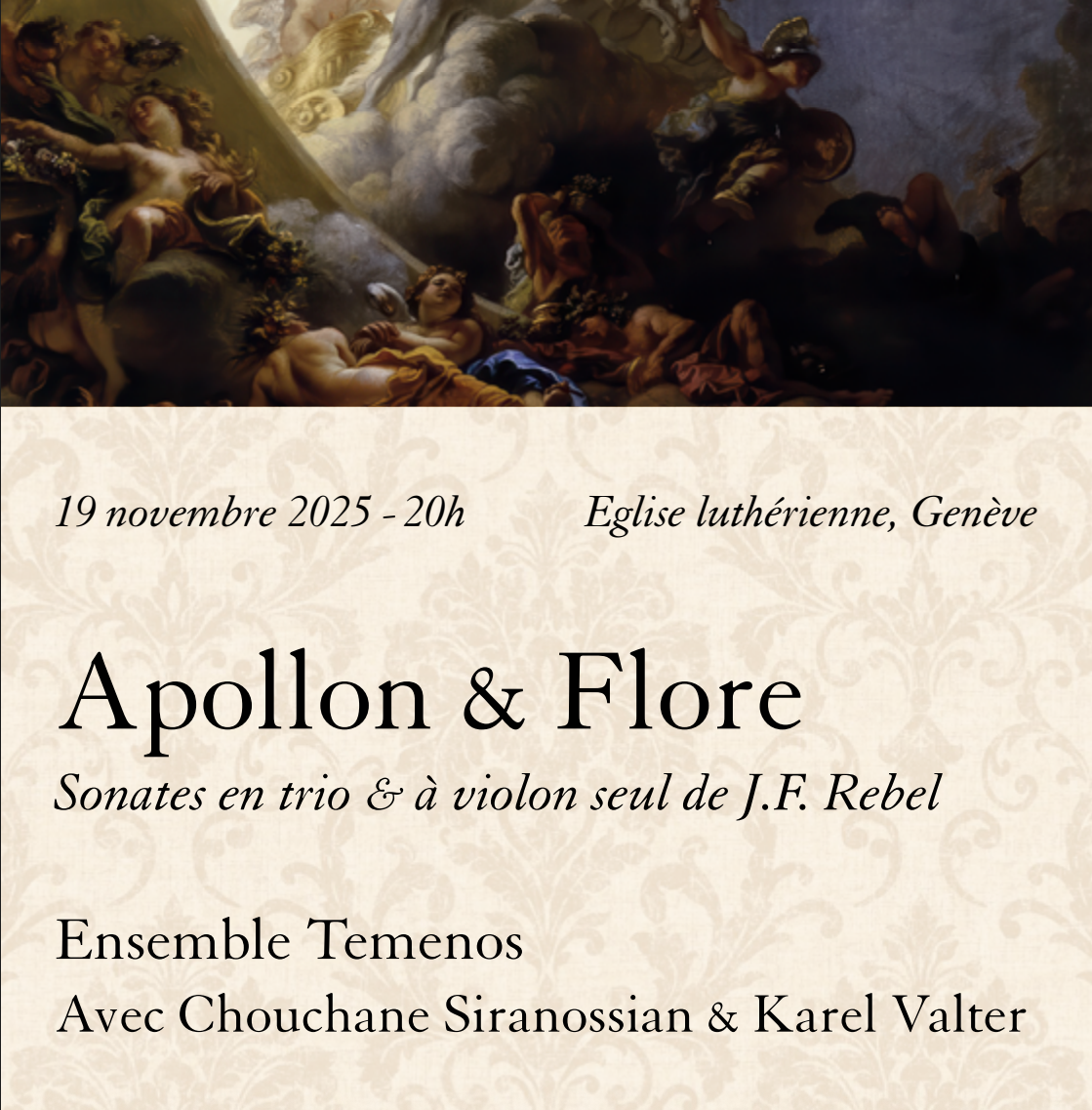 The Ensemble Temenos with Chouchane Siranossian presents a concert dedicated to Jean-Féry Rebel at the Lutheran Church of Geneva. This program delves into the instrumental music of Rebel, a violinist with the King’s 24 Violins and a composer for the Royal Academy of Music, who was both a student and legacy-bearer of Lully. Featured are the Trio Sonata “La Flore”, the solo violin sonatas from Opus 2, and the Sonata No. 7 in C minor “Tombeau de Monsieur de Lully”. The performance highlights the fusion of French dance and Italian influence, celebrating Rebel’s discreet virtuosity and characteristic stylistic harmony.