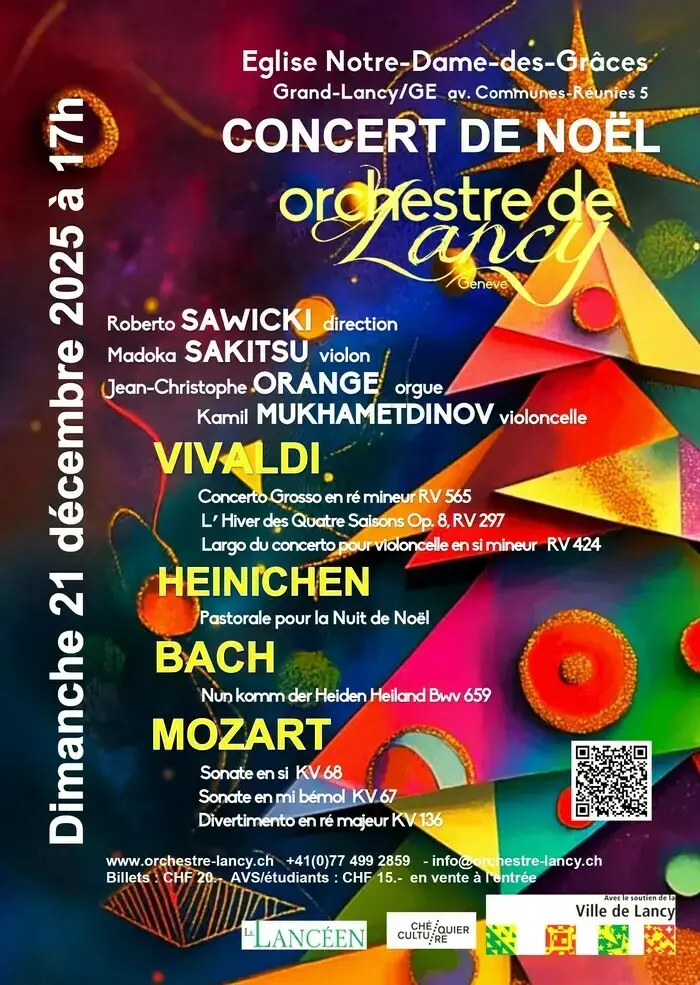 Conductor Roberto Sawicki leads the Lancy-Geneva Orchestra in a warm, orange-and-cinnamon scented Christmas programme celebrating the ensemble’s 50th anniversary. Three soloists — Madoka Sakitsu-Lapeyre (violin), Kamil Mukhametdinov (cello) and organist Jean-Christophe Orange — alternate luminous, spiritual repertoire that spans baroque and classical textures. From Vivaldi’s virtuosic Winter and Heinichen’s Pastorale to Bach chorale echoes and Mozart sonatas and divertimento, the evening unfolds with radiant sonorities and fresh, intimate interplay between organ, strings and orchestra.