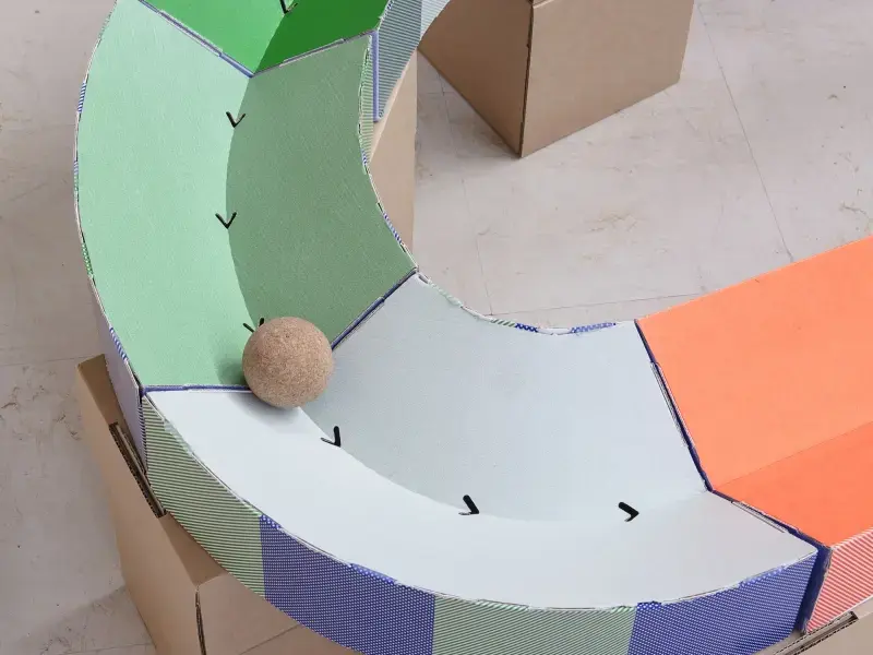 Explore coding through play with the duo Pinaffo & Pluvinage. Families are invited to turn colour into code by arranging colourful sequences that act as instructions to assemble cardboard modules and reveal a circuit. Drop a ball to watch it trace its path and discover cause and effect. Visitors can also create and save their own colour-coded circuits to share. Code Set sits between design, toy, installation and scenography, encouraging hands-on experimentation and sensory discovery.