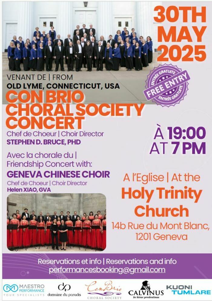 The American choir Con Brio will perform at the Holy Trinity Church in Geneva, featuring over 70 singers under the baton of Dr. Stephen Bruce, with Susan E. Saltus on the organ. Helen Xiao, conductor of the Chinese Choir of Geneva, will host and contribute to the musical program. The evening will kick off with a variety of pieces by the Chinese Choir of Geneva, followed by Con Brio performing works from different genres. The concert will culminate in a joint performance by both choirs, symbolizing collaboration and unity through music. This promises to be a richly rewarding musical experience, characterized by choral excellence and cultural diversity.