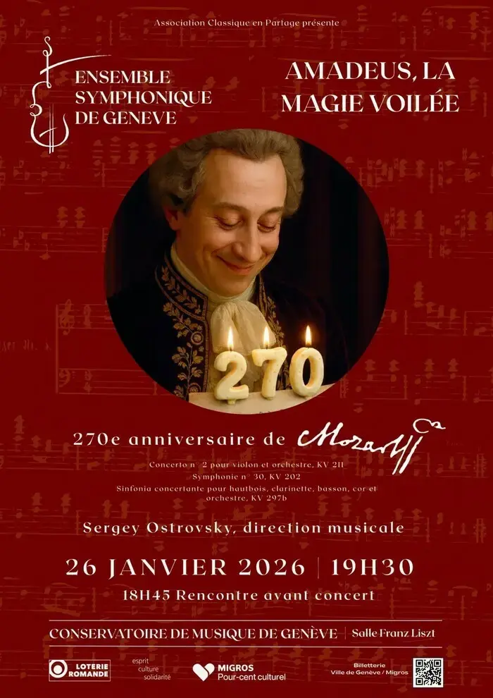 Led by conductor Sergey Ostrovsky, this intimate Mozart programme celebrates the composer’s 270th anniversary with rarely heard repertoire: Symphony No.30, Violin Concerto No.2 and the Sinfonia Concertante for winds. Soloists Christophe Quatremer (violin), Lior Michel Virot (oboe), Quentin Chartier (clarinet), Gabriele Gombi (bassoon) and Nicolas Marguet (horn) bring individual colours to a chamber-like orchestral texture. The evening favours clarity, refined phrasing and shimmering orchestral balance, revealing the hidden finesse and veiled magic of Mozart’s late eighteenth-century sound.