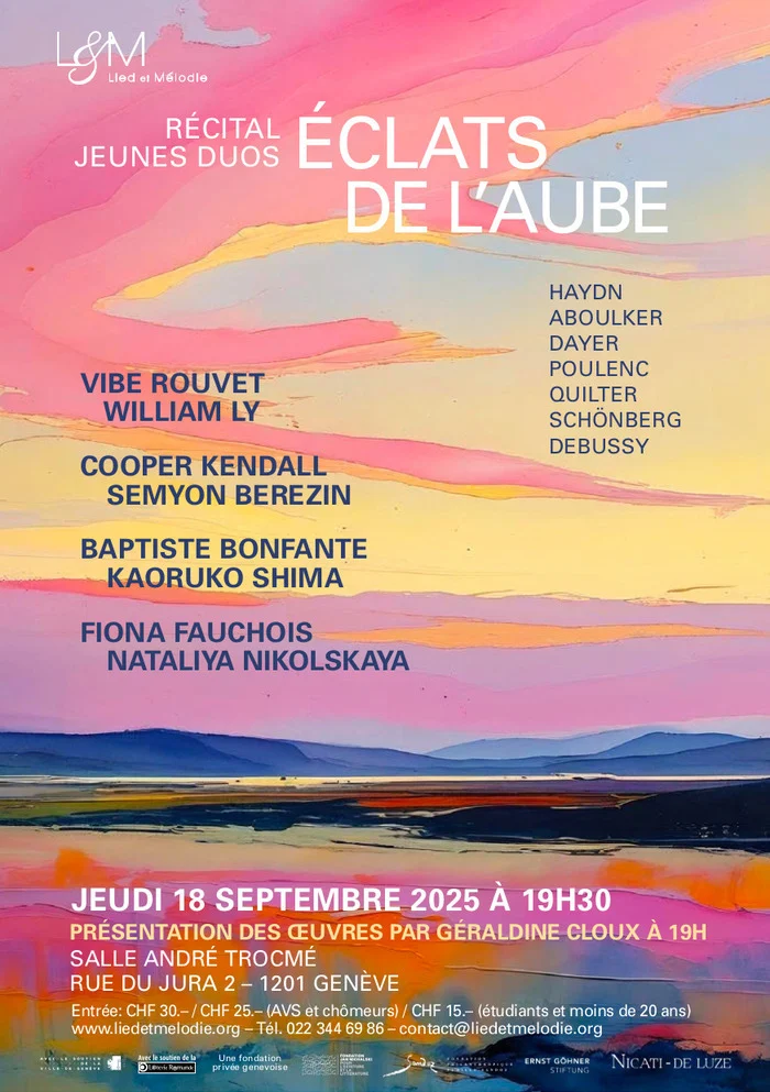 Eight talented young artists showcase a remarkable musical program featuring works by Haydn, Schumann, Debussy, Schönberg, Quilter, and Poulenc. The highlight of the recital includes world premiere performances of melodies set to poems by Marguerite Yourcenar, composed by Isabelle Aboulker and Xavier Dayer. The evening opens with an introduction by Géraldine Cloux, a musicologist, singer, and pianist. Attendees will have the opportunity to meet the composers and Marguerite Yourcenar’s great-nephew after the concert to discuss any questions they may have.