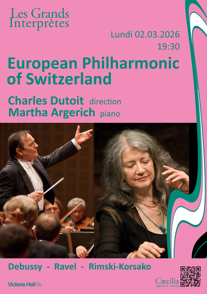 {"title":"European Philharmonic of Switzerland – Charles Dutoit \/ Martha Argerich","description":"The \u0022Les Grands Interpr\u00e8tes\u0022 series features the European Philharmonic of Switzerland conducted by Charles Dutoit, with Martha Argerich on piano. On the program are Debussy's Petite Suite, Ravel's Piano Concerto in G major, and Rimsky-Korsakov's Scheherazade.","start_date":"2026-03-02","end_date":"2026-03-02","date":"Monday 2 March 2026, 19:30","timings":[{"timing_start_date":"20260302T183000Z","timing_end_date":"20260302T203000Z"}]}