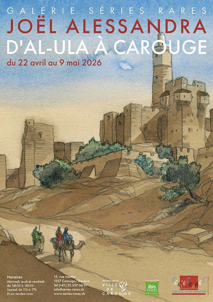 Joël Alessandra presents a personal exhibition of travel sketches and drawings gathered from journeys in Chad, Saudi Arabia and Mauritania, framed around his recent album “Déserts, dans l’infini des extrêmes”. The presentation includes nearly forty original pages from the graphic novel Les Voyages d’Ibn Battûta, as well as works created for Je est un autre and La Force des femmes. For this project the artist made new drawings of Carouge reproduced as postcards in partnership with the city.