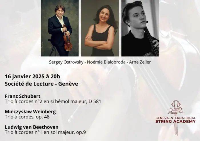 Experience a captivating evening featuring works by Beethoven, Schubert, and Weinberg, performed by a string trio led by Sergey Ostrovsky and Noémie Bialobroda. Immerse yourself in the elegance of classicism, the emotive power of lyricism, and the vigor of modernity through these three iconic trios, with Sergey Ostrovsky on violin, Noémie Bialobroda on viola, and Arne Zeller on cello.