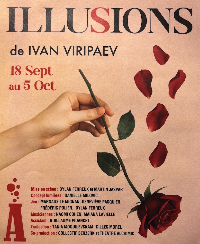 {"title":"Illusions","description":"\u003Cem data-start=\u00220\u0022 data-end=\u002211\u0022 data-is-only-node=\u0022\u0022\u003EIllusions\u003C\/em\u003E by Ivan Viripaev is a witty and heartfelt comedy exploring the secret lives of two long-married couples. As they reveal past indiscretions, hidden desires, and untold stories, laughter and emotion intertwine, prompting reflections on love, trust, and the delicate balance of long-term relationships. Enhanced by live cello and viola, this playful yet profound piece holds up a mirror to the joys and complexities of intimate life.\r\n\r\n\u003Cstrong\u003EIn French.\u003C\/strong\u003E","start_date":"2025-09-18","end_date":"2025-10-05","date":"18 September - 5 October","timings":[{"timing_start_date":"20250918T170000Z","timing_end_date":"20250918T190000Z"},{"timing_start_date":"20250926T170000Z","timing_end_date":"20250926T190000Z"},{"timing_start_date":"20250927T170000Z","timing_end_date":"20250927T190000Z"},{"timing_start_date":"20250928T170000Z","timing_end_date":"20250928T190000Z"},{"timing_start_date":"20250930T170000Z","timing_end_date":"20250930T190000Z"},{"timing_start_date":"20251001T170000Z","timing_end_date":"20251001T190000Z"},{"timing_start_date":"20251002T180000Z","timing_end_date":"20251002T200000Z"},{"timing_start_date":"20251003T170000Z","timing_end_date":"20251003T190000Z"},{"timing_start_date":"20251004T170000Z","timing_end_date":"20251004T190000Z"},{"timing_start_date":"20251005T170000Z","timing_end_date":"20251005T190000Z"}]}