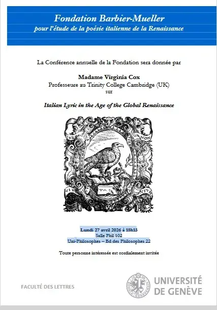 {"title":"Italian Lyric in the Age of the Global Renaissance","description":"Professor Virginia Cox, a scholar at Trinity College, Cambridge, brings extensive expertise in Italian Renaissance literature. She examines Italian lyric poetry within the wider global networks of the Renaissance, exploring circulation, translation, and cross-cultural influences that reshaped poetic forms and meanings. The lecture investigates how transnational contacts informed poetic practices and critical reception, revealing new perspectives on literary exchange and cultural mobility.\r\n\r\n\u003Cstrong\u003EIn English.\u003C\/strong\u003E","start_date":"2026-04-27","end_date":"2026-04-27","date":"Monday 27 April, 18:15","timings":[{"timing_start_date":"20260427T181500Z","timing_end_date":"20260427T201500Z"}]}