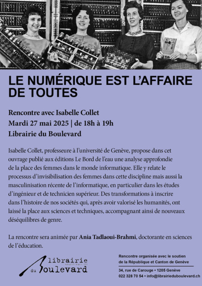 Isabelle Collet, a professor at the University of Geneva, presents an insightful analysis on women’s roles in the field of computer science in her book published by Le Bord de l’eau. She discusses the marginalization of women in this discipline and the recent trend of its increased masculinization. The discussion will be led by Ania Tadlaoui-Brahmi, a doctoral candidate in educational sciences.