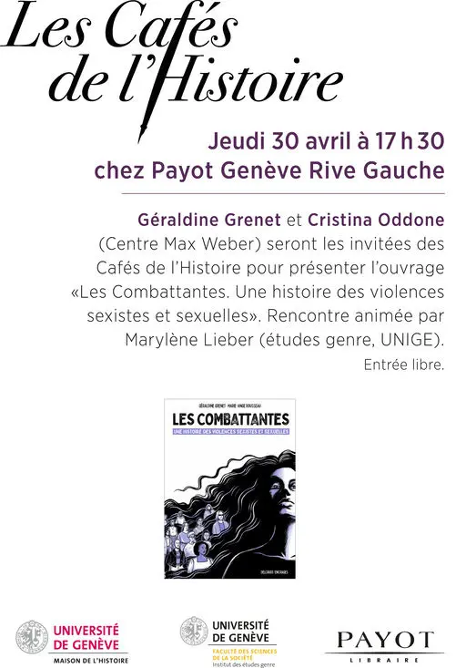 Géraldine Grenet and Cristina Oddone (Centre Max Weber) discuss their book Les Combattantes, which traces the history of sexist and sexual violence through archival research and feminist scholarship. Moderated by Marylène Lieber (gender studies, UNIGE), the conversation examines legal, social and cultural dynamics, methodological challenges and the implications for contemporary gender debates. Speakers bring interdisciplinary perspectives to illuminate continuities and ruptures in how violence has been documented and understood.
