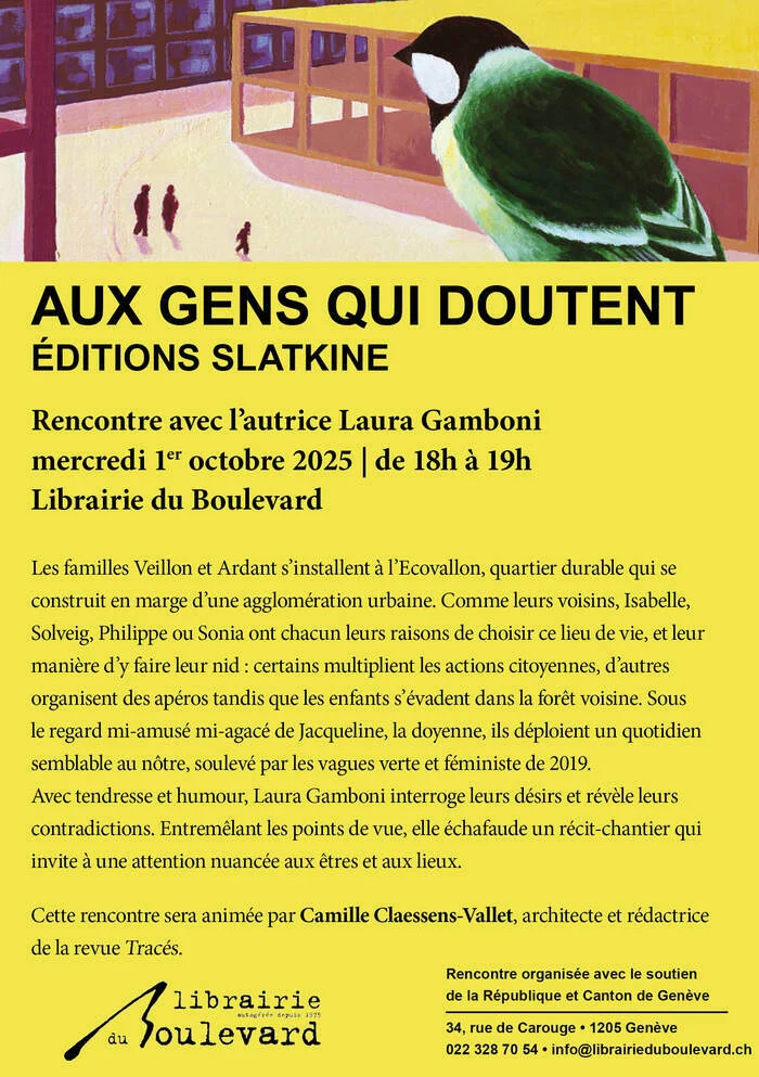 Laura Gamboni introduces her novel “Aux gens qui doutent,” recently published by Slatkine. The story delves into the lives of the Veillon and Ardant families in the sustainable Ecovallon neighborhood, where residents navigate their roles amidst civic engagement and social gatherings. With humor and warmth, the author explores their desires and contradictions against the backdrop of the ecological and feminist movements of 2019. The discussion will be led by Camille Claessens-Vallet, an architect and editor for the magazine Tracés.