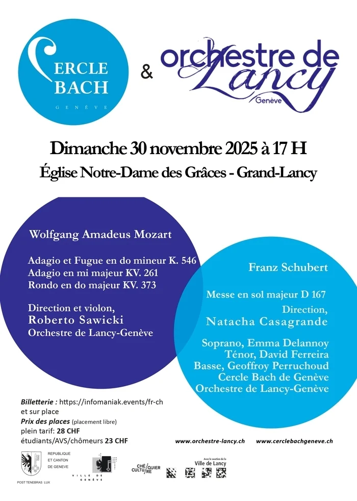 L’Orchestre de Lancy-Genève is celebrating its 50th anniversary in partnership with the Cercle Bach de Genève through a concert showcasing the works of Mozart and Schubert. Conducted by Roberto Sawicki and Natacha Casagrande, and featuring soloists Emma Delannoy, David Ferreira, and Geoffroy Perruchoud, the program offers expressive and radiant pieces that combine rich harmonies with delicate emotions.