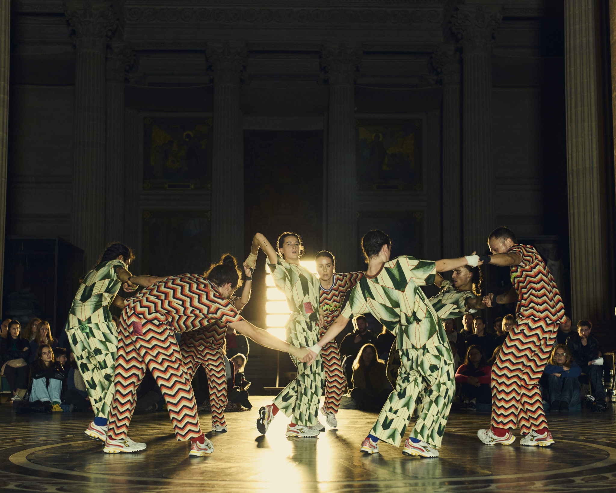 Inside a circular setup, eight dancers and two musicians (Gwenaël Drapeau and Mélanie Chartreux) create a hypnotic trance using acoustic sounds and electronic loops. Gentle, mobile lighting enhances this evolving space of communal celebration.
