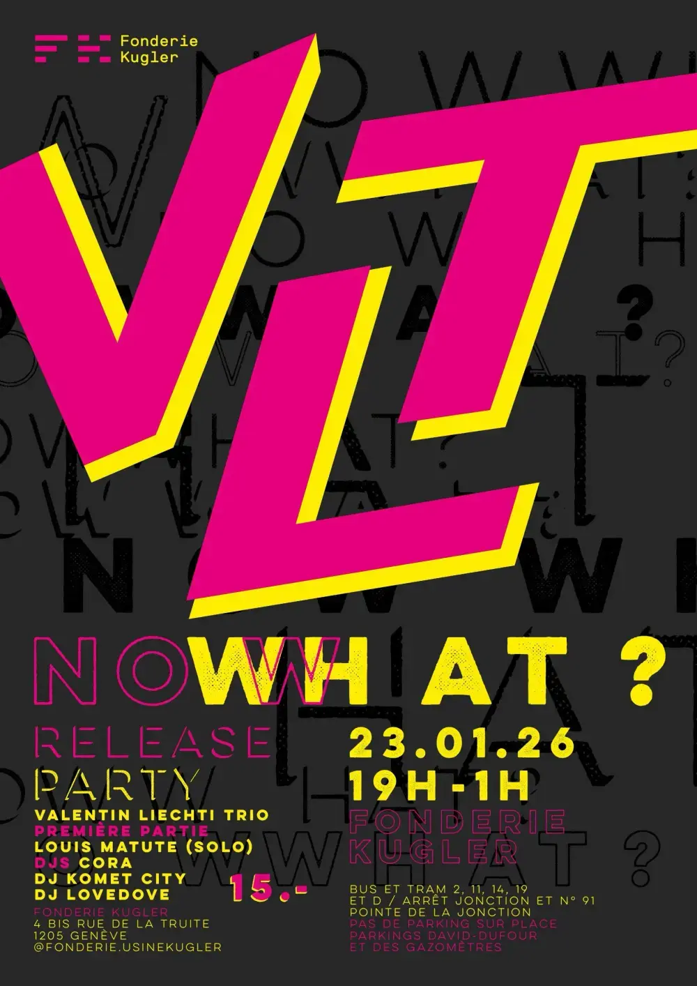 The Valentin Liechti Trio celebrates the release of their new album NOW WHAT? with a night full of music. Opening the evening, Geneva guitarist Louis Matute performs solo for the first time, offering an intimate and rare set. The trio follows, blending acoustic and electric sounds in a melodic yet experimental universe, before Cora, DJ Komet City, and DJ Lovedove take over to close the night on the dancefloor. A jazz and electronic evening not to be missed.