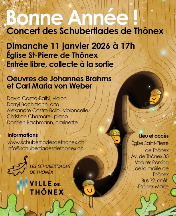 Begin the year with an unforgettable evening of chamber music featuring the virtuosic Grand Duo Concertant by Carl Maria von Weber and the deeply moving Piano Quartet No. 3, Op. 60, by Johannes Brahms. The performance brings together clarinetist Damien Bachmann and his brother Darryl, pianist Christian Chamorel, and the brothers David and Alexandre Castro-Balbi on violin and cello for a program that blends technical mastery with heartfelt expression.