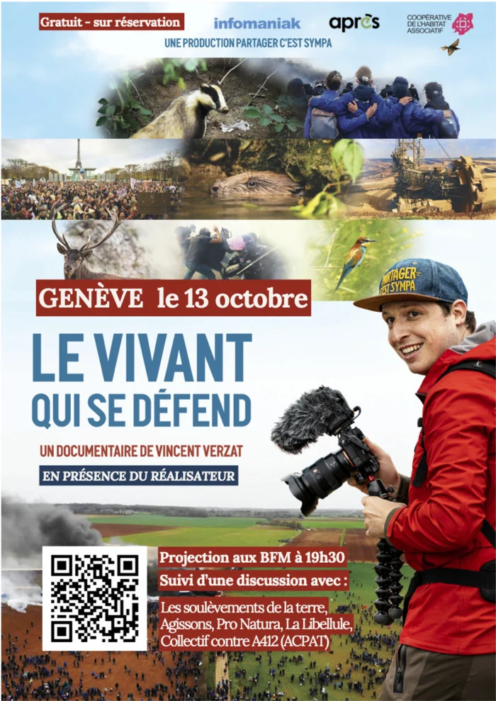Screening of Le Vivant Qui Se Défend, a film focused on nature preservation, followed by a discussion with filmmaker Vincent Verzat and local ecological associations. Vincent Verzat, known for his YouTube channel “Partager c’est Sympa,” showcases a decade of ecological activism in France, highlighting struggles to protect nature and habitats.