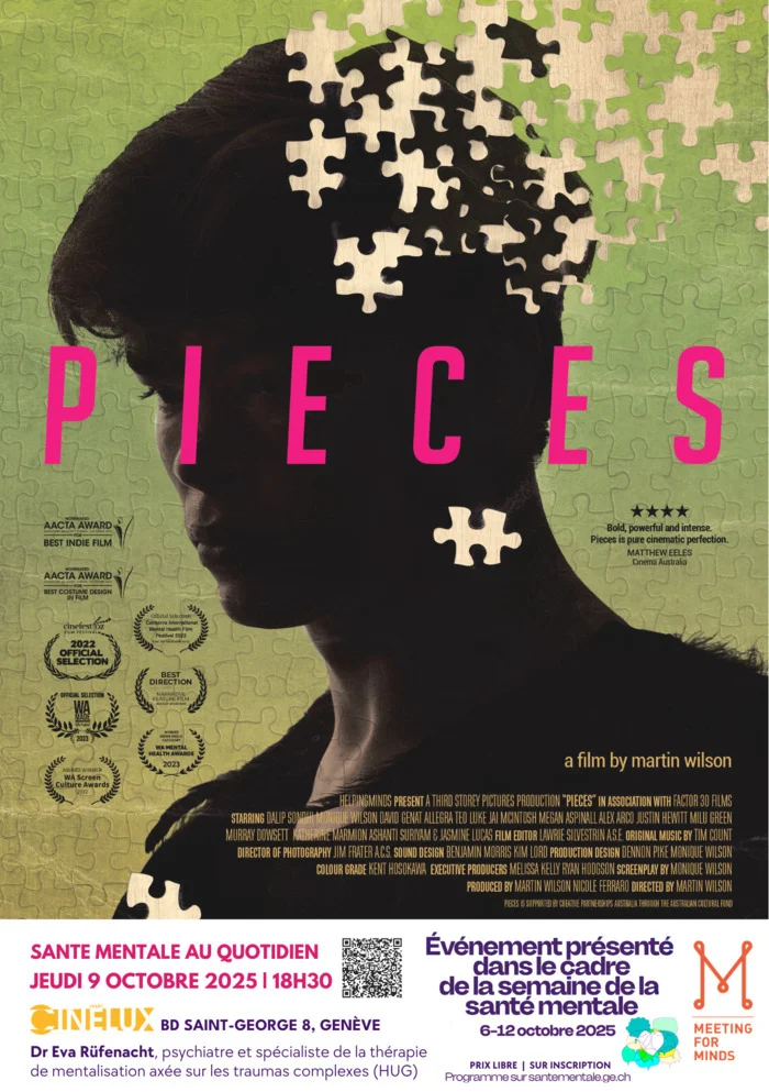 As part of Geneva’s Mental Health Week, Meeting for Minds is offering a special screening of the film PIECES, directed by Martin Wilson, at Cinélux. This feature film, co-produced by an Australian NGO, sheds light on the experiences of neurodivergent individuals and their loved ones, tackling themes of isolation and discrimination. Following the screening, a discussion will be led by Dr. Eva Rüfenacht, a psychotherapist and psychiatrist at HUG.