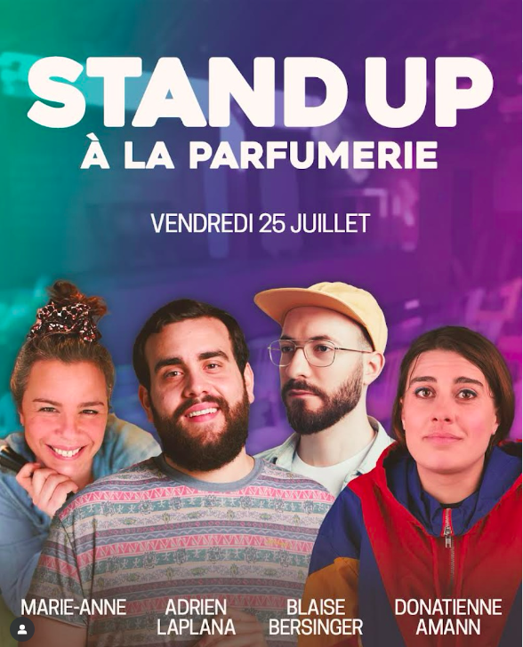 Stand-up comedy takes over La Parf’ terrace with a lively evening hosted by Adrien Laplana and featuring Blaise Bersinger, Marie-Anne, and Donatienne Amann. Expect sharp jokes, summer vibes, and a festive atmosphere continuing late into the night.