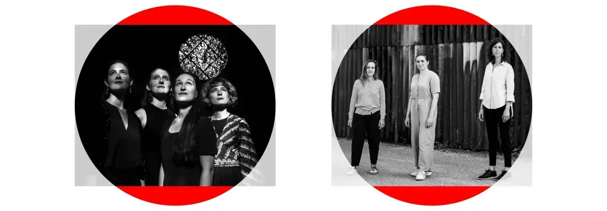 Sur Le Temps brings together Ensemble Batida, a contemporary trio of percussionists (Alexandra Bellon, Anne Briset, Jeanne Larrouturou), and the vocal quartet Contre le Temps, whose female voices specialise in medieval repertoire. The programme juxtaposes organum with open improvisation, exploring the distance between a centuries‑old vocal practice and an intensified attention to the present. The first part presents organum; later the musicians engage in improvised encounters that blur historical and contemporary sound worlds.