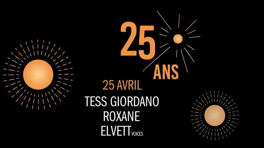 Pour célébrer ses vingt‑cinq ans, cette soirée met en lumière trois univers féminins de la scène genevoise, sensibles et proches. Tess Giordano ouvre avec une pop‑folk/rock en première partie, puis Roxane propose un répertoire folk‑soul‑pop vintage, rehaussé sur quelques titres par un quatuor à cordes dirigé par Marion Devaud. Elvett Voices conclut en formule piano et voix, un projet féminin, acoustique et intimiste centré sur l’émotion partagée.