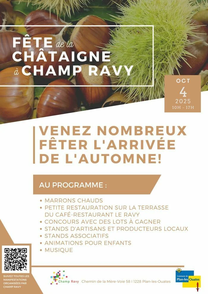 Célébrez l’automne au Champ Ravy à l’occasion du Festival de la Châtaigne, avec des activités pour tous les âges, 22 stands présentant des artisans et associations locales, ainsi que des châtaignes chaudes du Valais. L’événement propose une ambiance festive avec des stands de nourriture et diverses attractions, pour une journée conviviale et agréable pour tous les visiteurs.