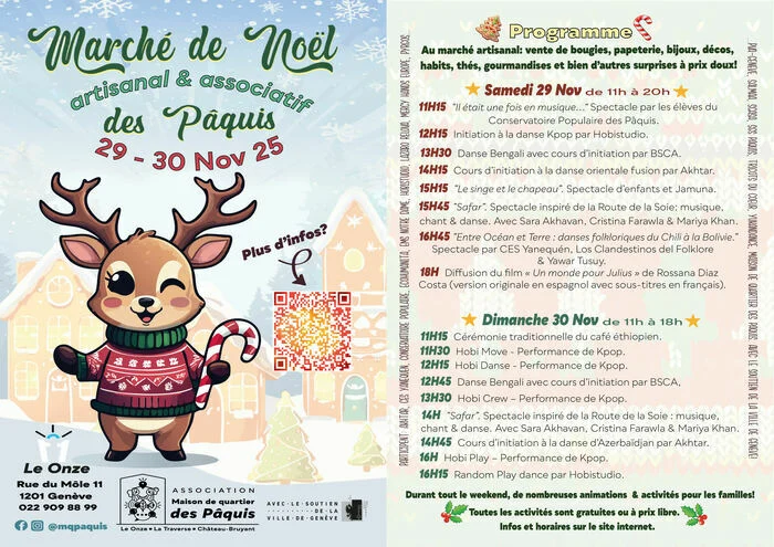 Une quinzaine d’associations organise un marché artisanal de Noël à la Maison de quartier des Pâquis, avec vente de bijoux, décorations, accessoires, habits, thés, biscuits et gourmandises à prix doux. De nombreuses animations festives sont prévues et une restauration variée est proposée. Tous les fonds récoltés soutiendront les projets des associations participantes.
